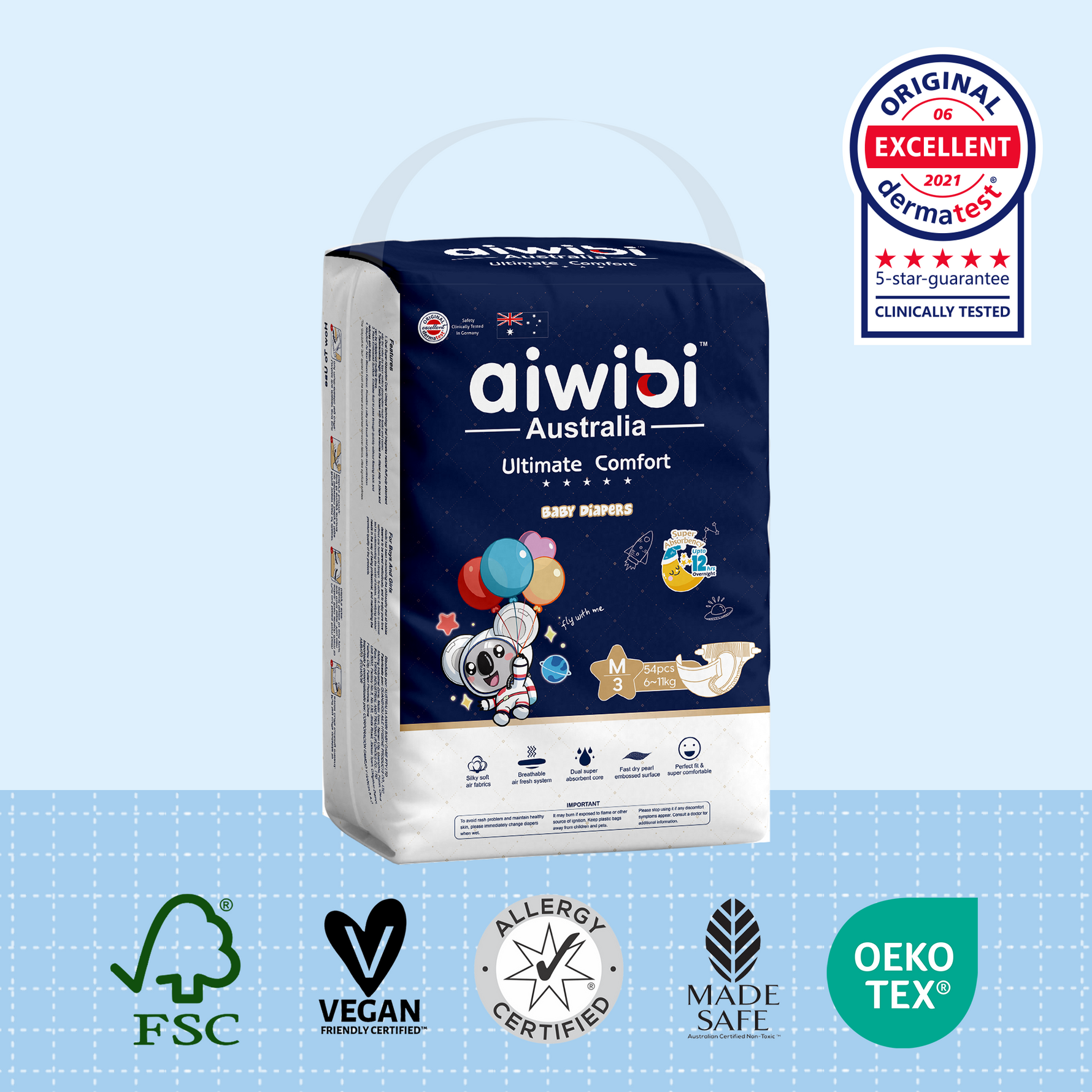 - Los pañales Aiwibi están certificados por el Instituto Dermatológico Alemán Dermatest, lo que garantiza su suavidad con la piel de tu bebé. No añadimos fragancias, extractos, colorantes ni otros productos químicos agresivos, lo que los hace inodoros e hipoalergénicos.