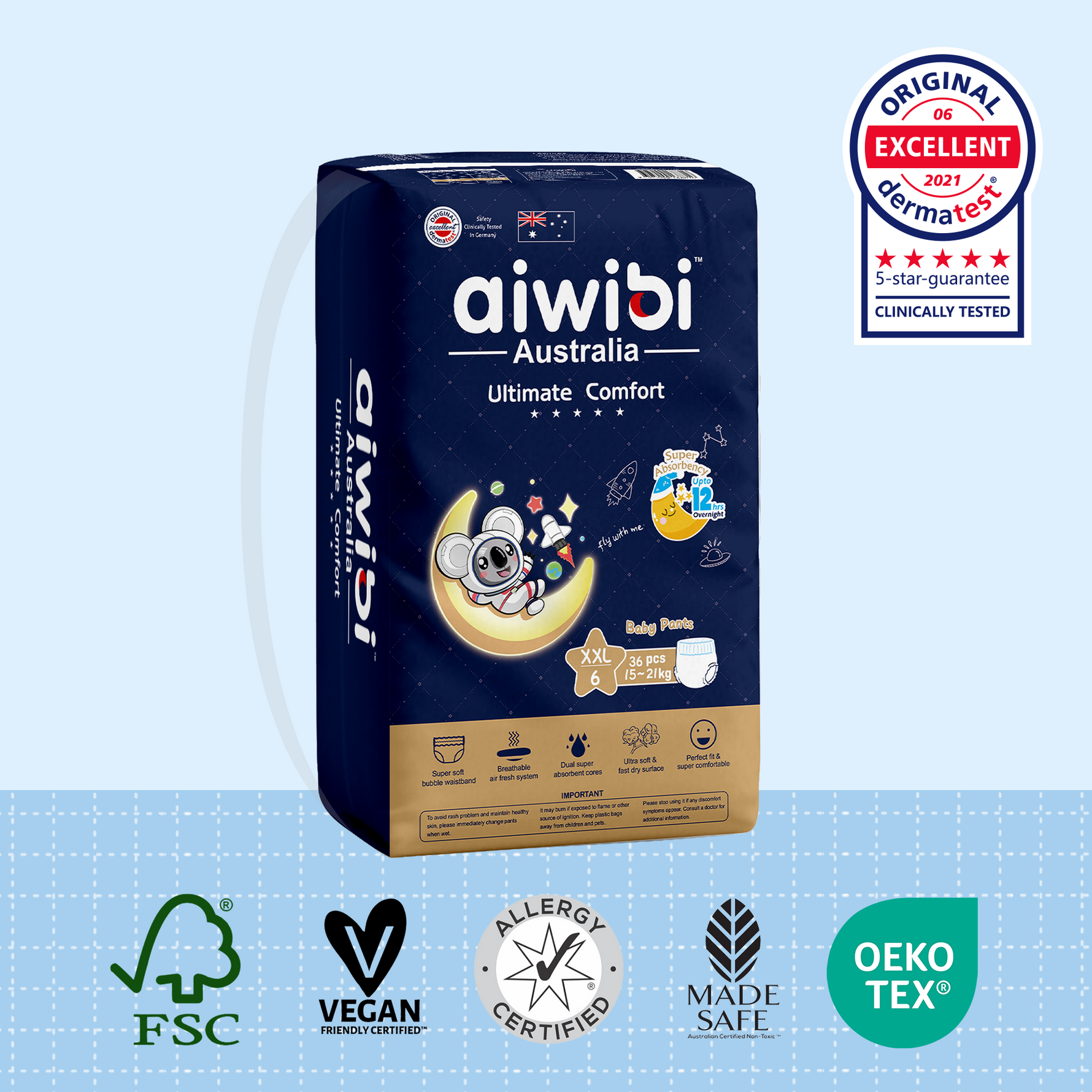 - Los pañales Aiwibi están certificados por el Instituto Dermatológico Alemán Dermatest, lo que garantiza su suavidad con la piel de tu bebé. No añadimos fragancias, extractos, colorantes ni otros productos químicos agresivos, lo que los hace inodoros e hipoalergénicos.
