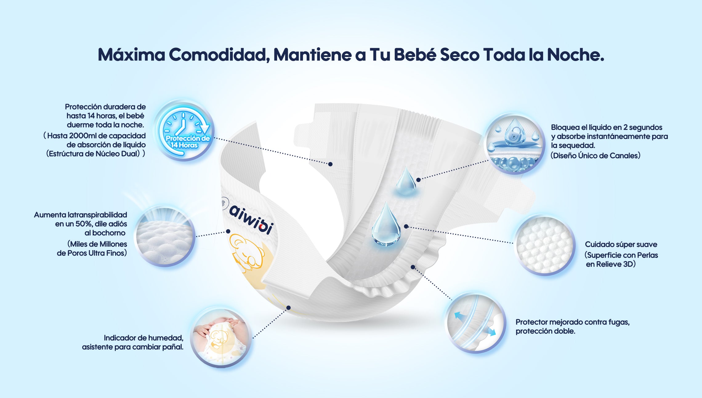 - Que absorbe rápidamente la humedad y retiene hasta 2000 ml,brinda una protección durante toda la noche y comodidad duradera.