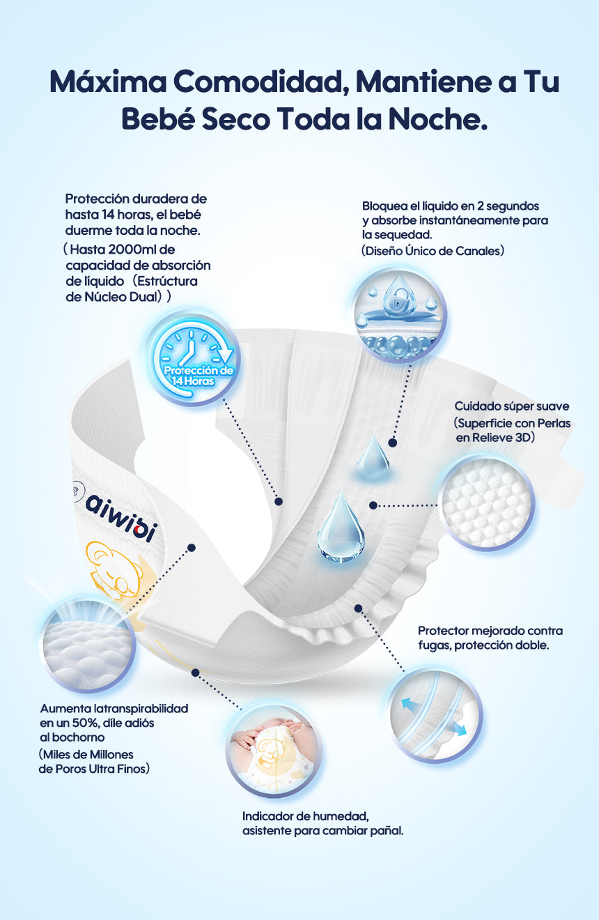 Los pañales Aiwibi están fabricados con pulpa de madera de alta calidad derivada de la naturaleza. Esta pulpa proviene de bosques gestionados de forma sostenible, por lo que, si bien utilizamos recursos naturales, también priorizamos la protección del medio ambiente y la sostenibilidad. A través de un procesamiento fino, mantenemos la absorción y la suavidad naturales del material para brindarle a su bebé una experiencia de uso cómoda y, al mismo tiempo, reducir la irritación de su piel sensible.